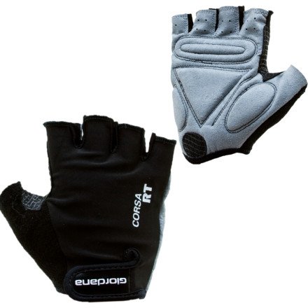 The Giordana Corsa RT Gloves have been designed for riders who want to have soft protection against the rigors of the road without suffering from the over-padding common to many gloves. The Corsa RT, offers just enough padding to protect, but not so much that you lose the immediacy of control when holding onto the bars. The lightweight lycra back keeps your hands comfortable and airy. You won't feel like your knuckles are getting too much pressure from the material when you tighten your grip. The hook-and-loop closure at the wrist makes donning them easy. The terry cloth thumb pad makes wiping your nose or sweat from your brow a no-scratch affair. The durable leather palm has been strategically padded so that the least amount of space has been reinforced with padding, but just at the perfect, high-pressure spots. The rest of the palm is covered in supple leather, making it feel like you have no barrier between your hands and the bars. The Giordana Corsa RT Gloves are available in Black and come in sizes Small through X-Large.